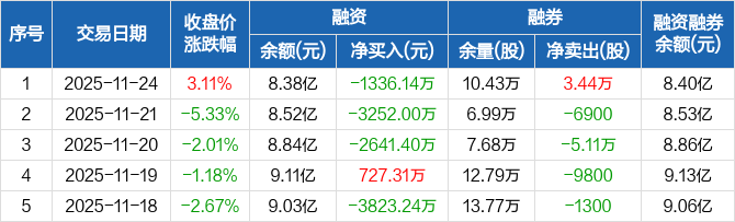 安泰科技融资融券信息显示,2025年11月24日融资净偿还1336.14万元;融资余额8.38亿元,较前一日下降1.57%
