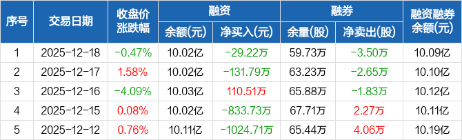 中科三环:融资净偿还29.22万元,融资余额10.02亿元(12-18)