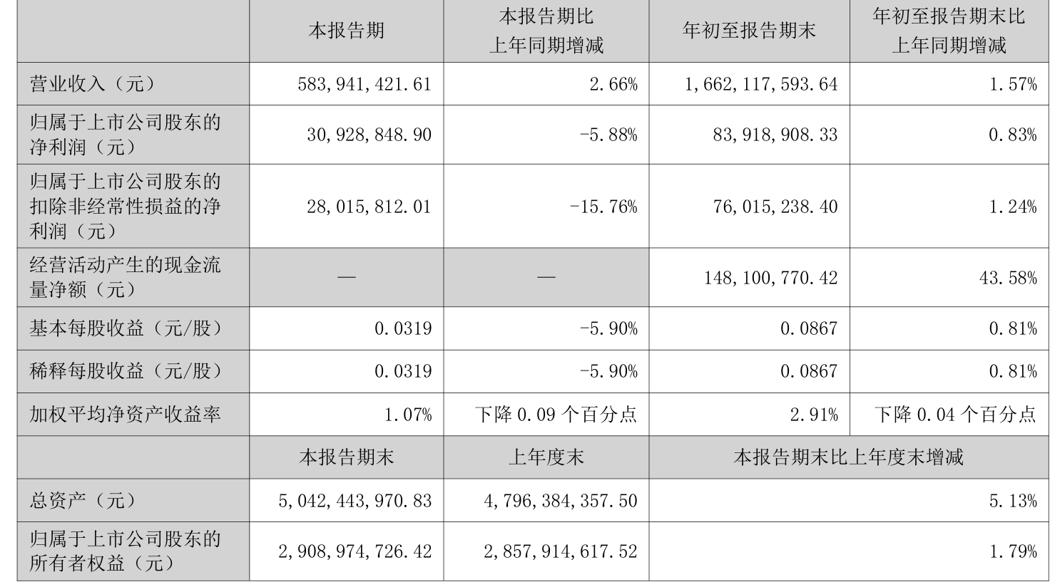 中证智能财讯佛塑科技(000973)10月30日披露2025年第三季度报告。前三季度公司实现营业总收入16.62亿元,同比增长1.57%;归母净利润8391.89万元,同比增长0.83%;扣非净利润7601.52万元,同比增长1.24%;经营活动产生的现金流量净额为1.48亿元,同比增长43.58%;报告期内,佛塑科技基本每股收益为0.0867元,加权平均净资产收益率为2.91%。