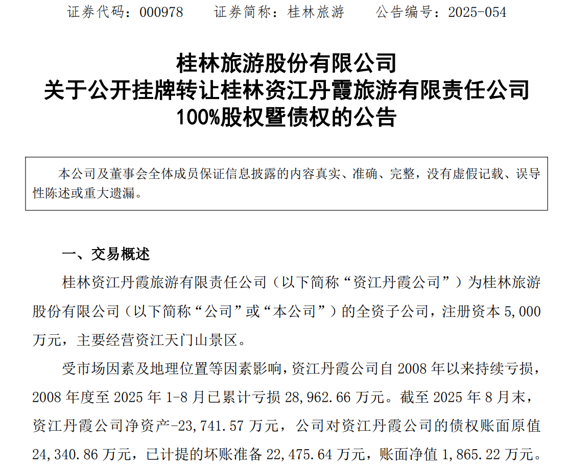 11月25日晚间,桂林旅游(000978)公告称,决定公开挂牌转让全资子公司资江丹霞公司100%股权及债权。资江丹霞公司自2008年以来持续亏损,累计亏损达2.9亿元,截至2025年8月末净资产为-2.37亿元,公司对资江丹霞公司的债权账面原值2.4亿元,已计提的坏账准备2.2亿元,账面净值1865万元。为了优化公司资产结构并减少亏损,董事会于2025年10月9日通过了相关议案,挂牌价格定为3450万元。