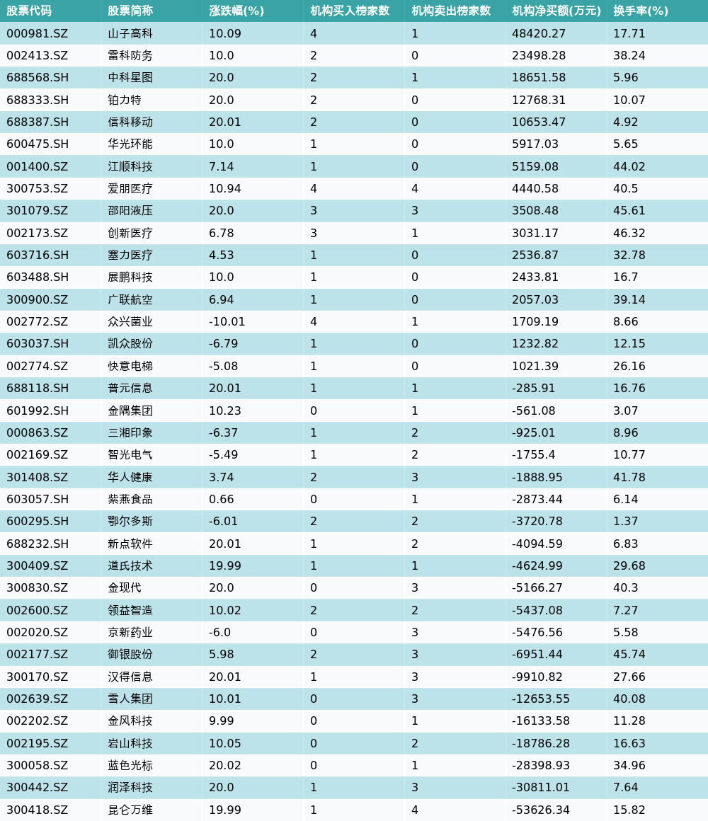 21智讯1月12日电,南财金融终端数据显示,因当日异动登上龙虎榜的个股中,36只沪深A股龙虎榜出现了机构的身影,机构合计净卖出67042.65万元,具体来看,机构净买入16只个股,净卖出20只个股。其中,机构净买入前三分别为山子高科(000981.SZ)、雷科防务(002413.SZ)与中科星图(688568.SH),详情见下图:机构净卖出的个股中,前三分别为昆仑万维(300418.SZ)、润泽科技(300442.SZ)与蓝色光标(300058.SZ)。