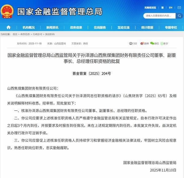 孙泽源获批担任山西焦煤集团财务公司副董事长、总经理