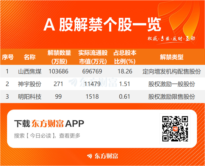【明日解禁】明日3股解禁 山西焦煤、神宇股份解禁市值居前