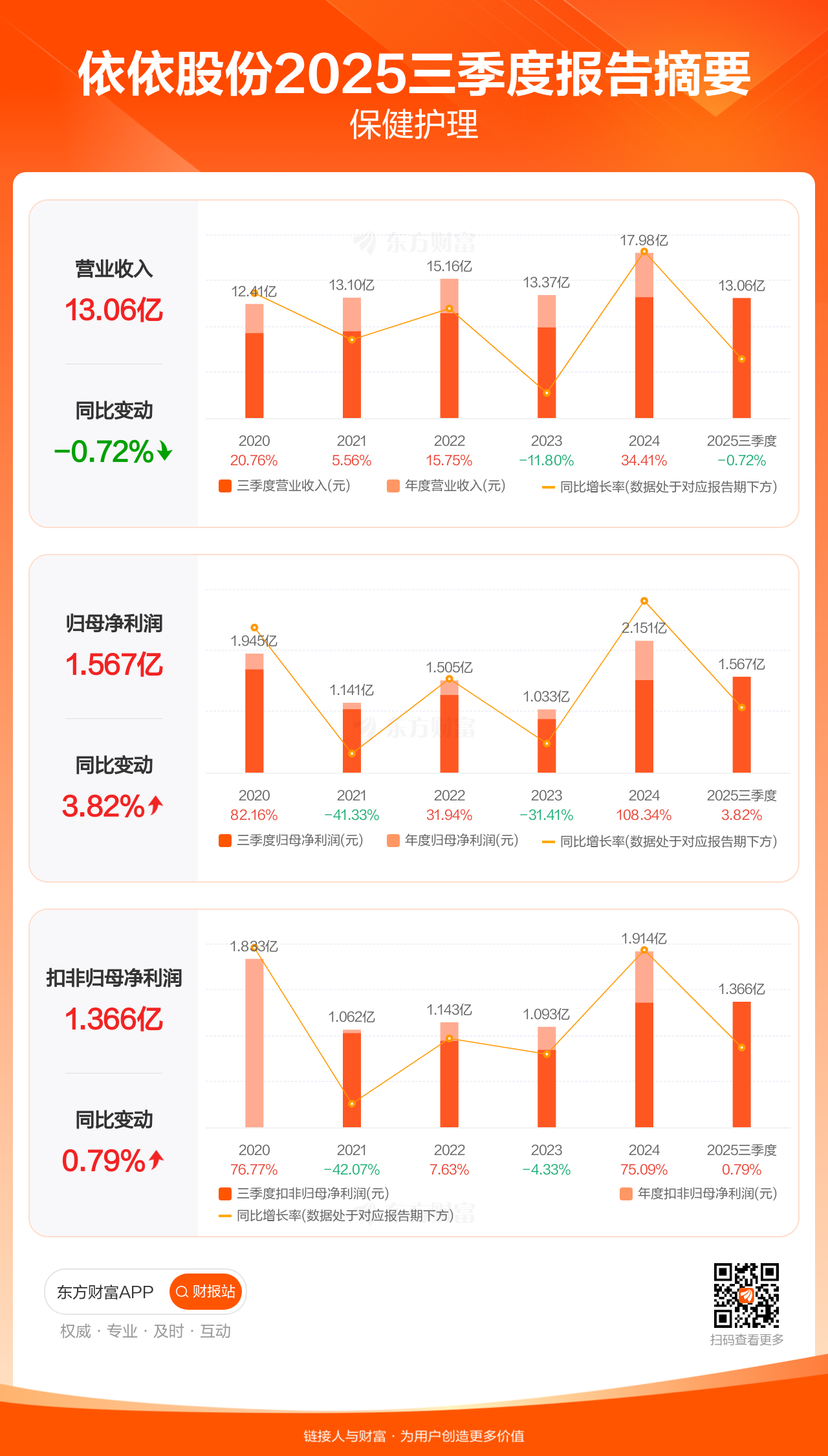 依依股份10月27日发布2025年三季报显示,公司前三季实现营业收入13.06亿元,同比下滑0.72%;归母净利润1.57亿元,同比增长3.82%;扣非归母净利润1.37亿元,同比增长0.79%。
