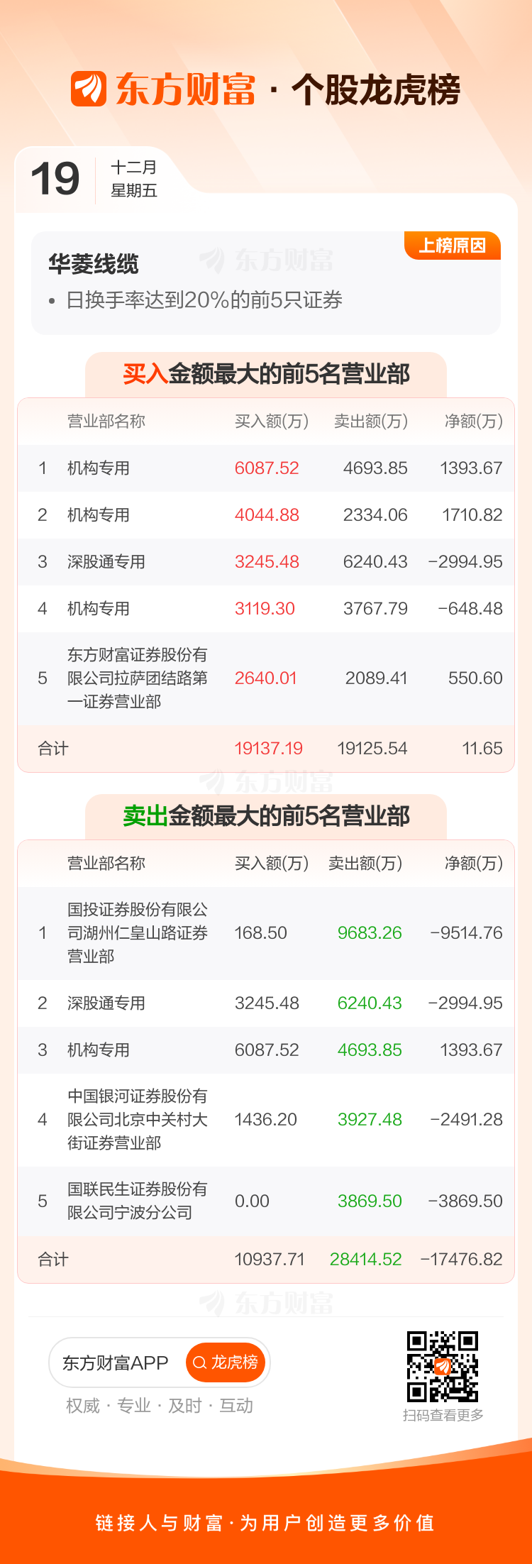 交易所2025年12月19日公布的交易公开信息显示,华菱线缆因成为日换手率达到20%的前5只证券上榜。华菱线缆当日收报21.17元,涨跌幅-0.38%,偏离值46.23%,换手率46.20%,成交额25.50亿。