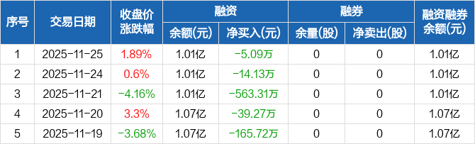融资方面,当日融资买入632.3万元,融资偿还637.38万元,融资净偿还5.09万元,连续5日净偿还累计787.51万元。融券方面,融券卖出0股,融券偿还0股,融券余量0股,融券余额0元。融资融券余额合计1.01亿元。
