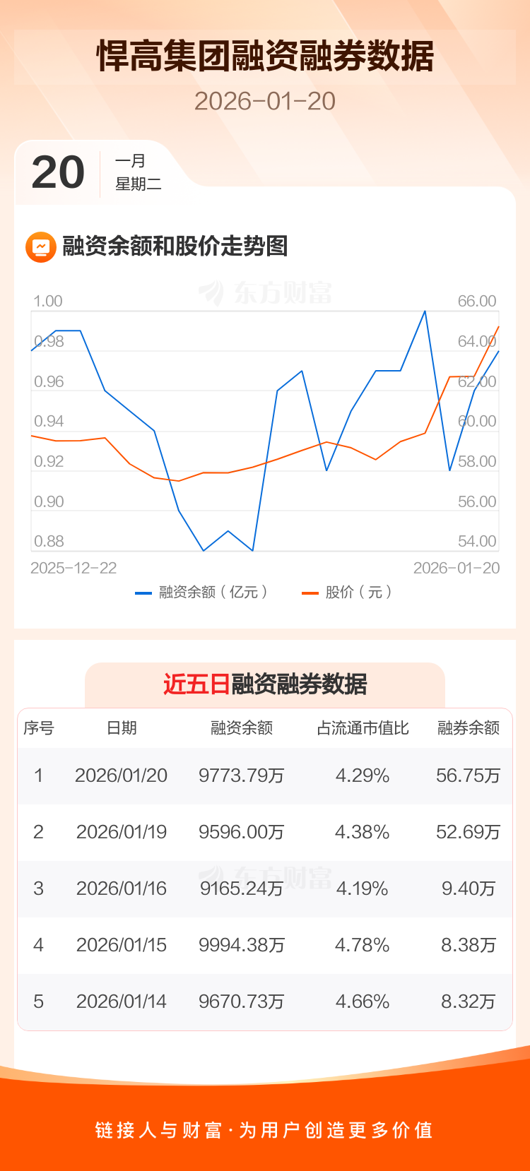 交易所最新数据显示,悍高集团于2026年1月20日获融资买入1750.90万元,融资偿还1573.10万元,当日融资净买入177.79万元。目前,该股融资余额9773.79万,占流通市值比例为4.29%。