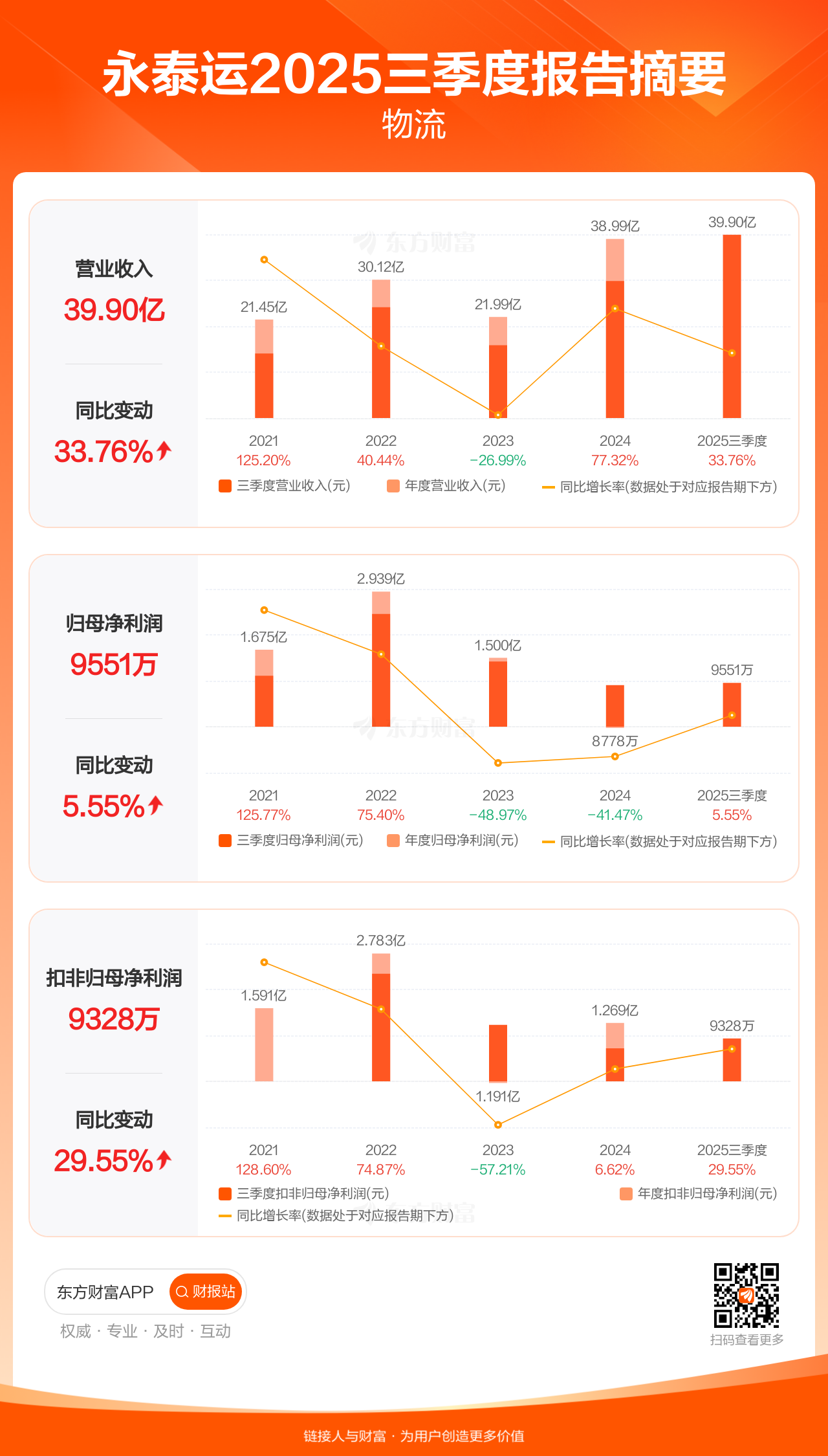 永泰运10月29日发布2025年三季报显示,公司前三季实现营业收入39.90亿元,同比增长33.76%;归母净利润9551.30万元,同比增长5.55%;扣非归母净利润9327.55万元,同比增长29.55%。