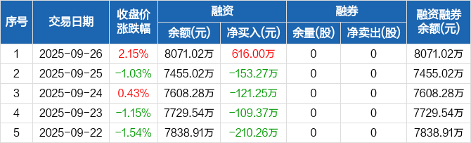 永达股份:融资净买入616万元,融资余额8071.02万元(09-26)