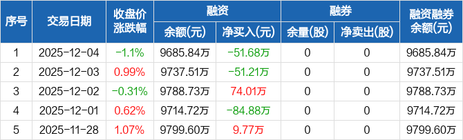 永达股份:融资净偿还51.68万元,融资余额9685.84万元(12-04)