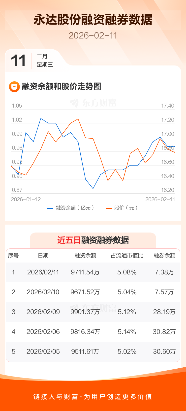 交易所最新数据显示,永达股份于2026年2月11日获融资买入441.91万元,融资偿还401.89万元,当日融资净买入40.02万元。目前,该股融资余额9711.54万,占流通市值比例为5.08%。