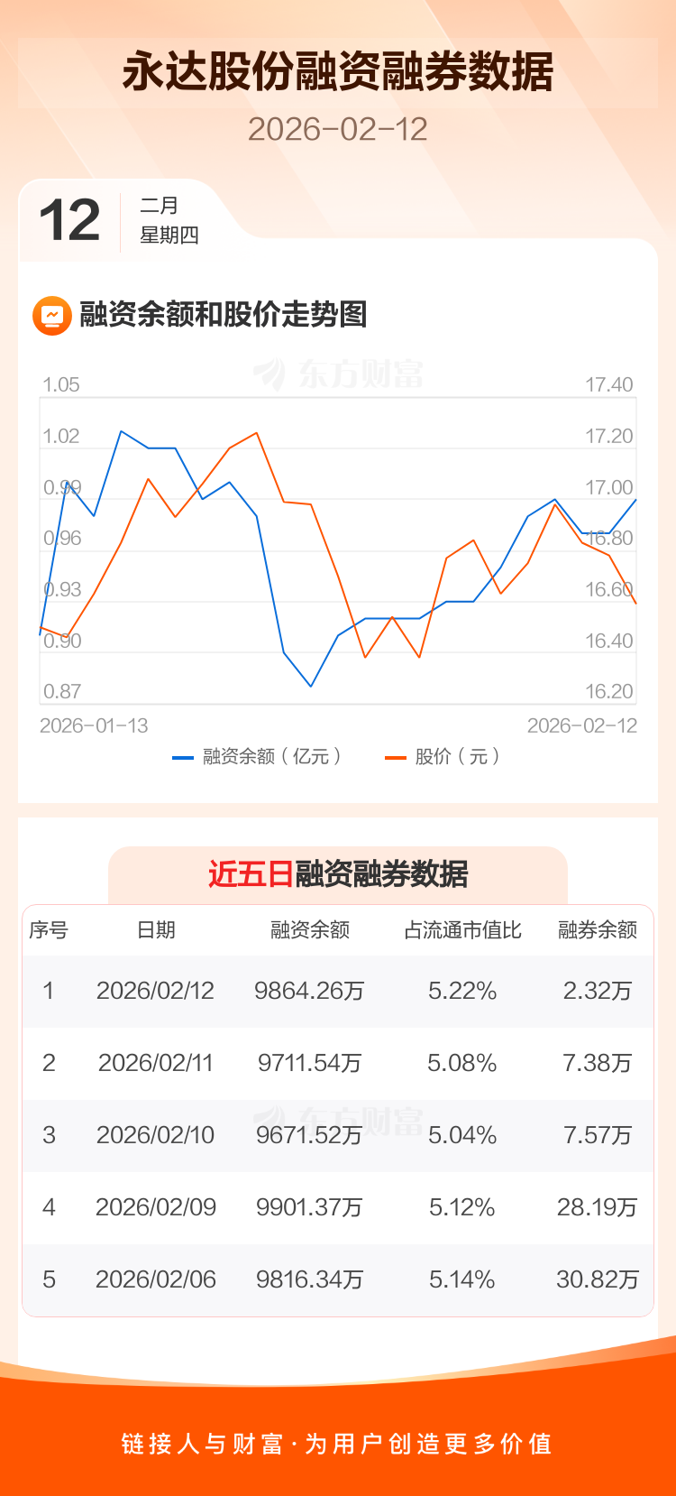 交易所最新数据显示,永达股份于2026年2月12日获融资买入595.36万元,融资偿还442.63万元,当日融资净买入152.72万元。目前,该股融资余额9864.26万,占流通市值比例为5.22%。