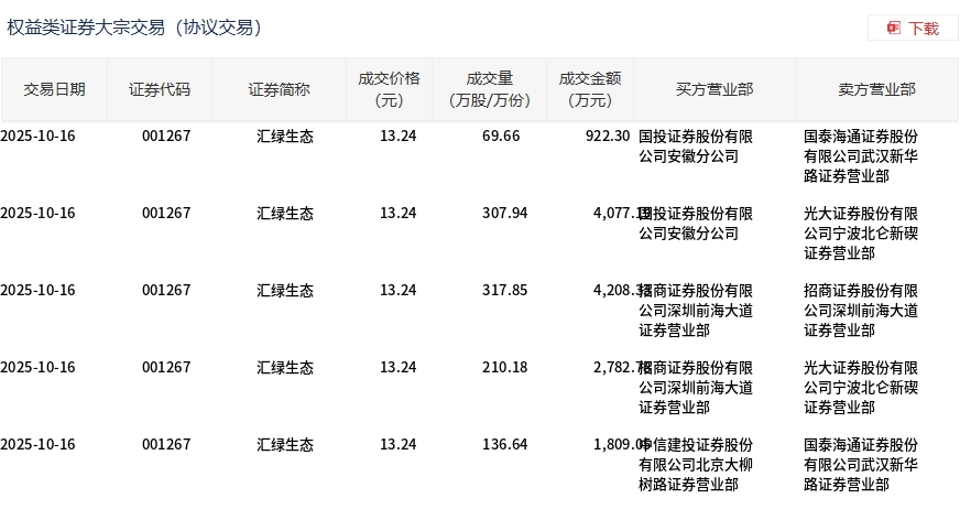 汇绿生态今日大宗交易折价成交1042.27万股,成交额1.38亿元