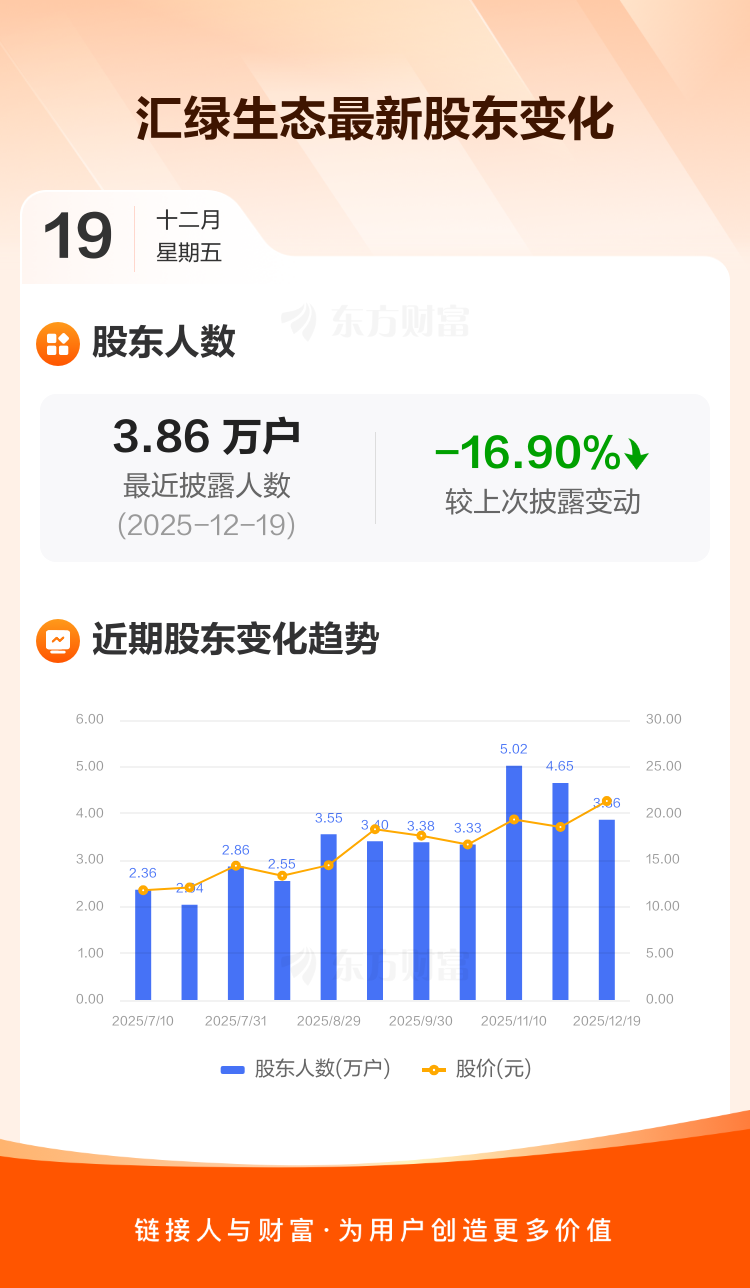 汇绿生态:截至12月19日最新股东户数3.86万户,较上期减少16.90%