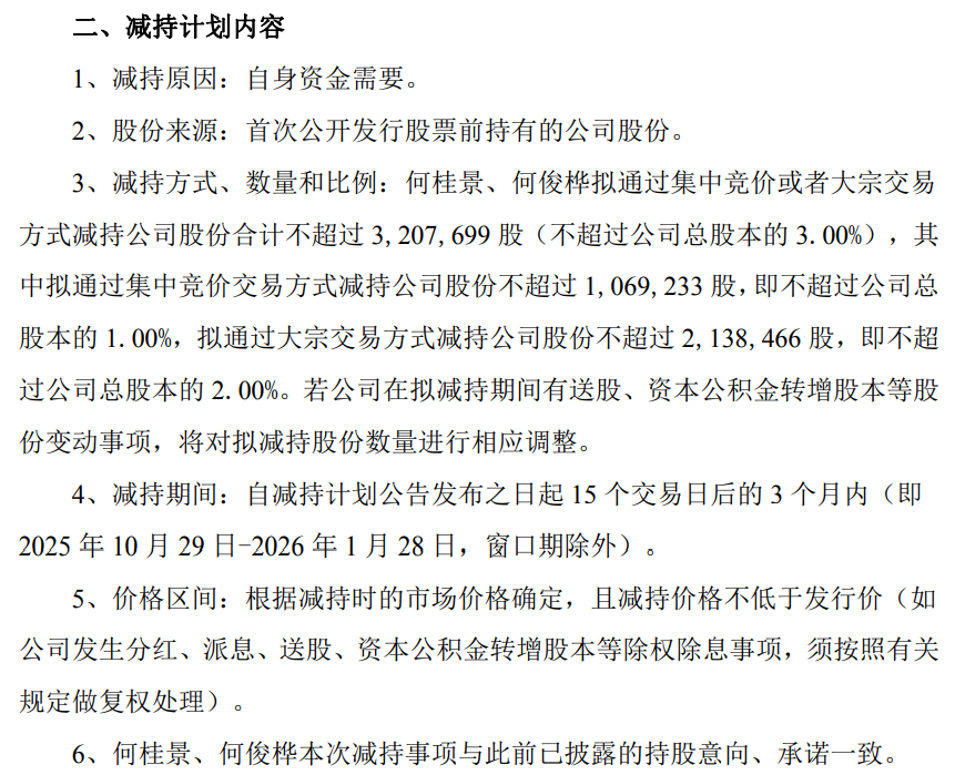 9月28日,联合精密(001268)公告,公司控股股东、实际控制人之一、董事长何桂景及控股股东、实控人之一、副董事长、副总经理何俊桦计划在2025年10月29日至2026年1月28日期间,通过集中竞价或大宗交易方式减持公司股份合计不超过320.77万股,占公司总股本的3.00%。