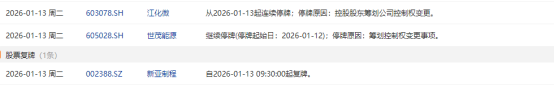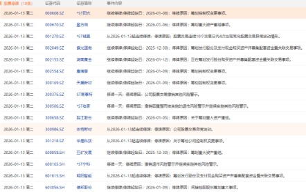 上证报中国证券网讯 1月13日,8家公司临停:*ST铖昌、ST易事特、*ST名家、志特新材、华是科技、*ST宁科、明阳智能、江化微,1家公司复牌:新亚制程。
