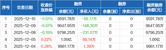 强邦新材:融资余额9591.78万元,创历史新低(12-10)