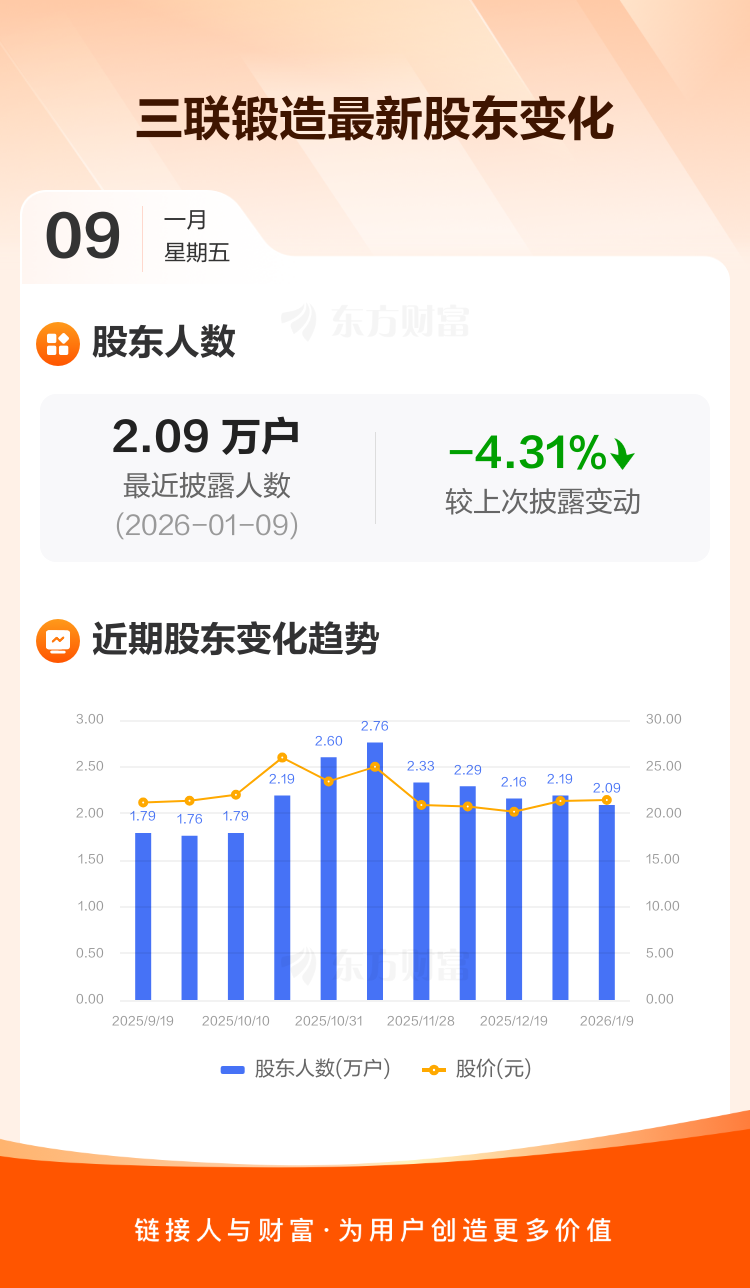 三联锻造:截至1月9日最新股东户数2.09万户,较上期减少4.31%