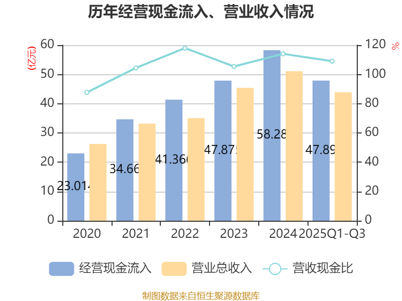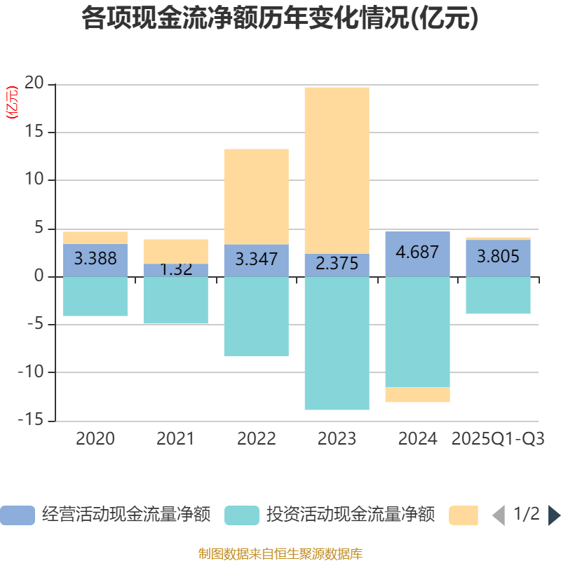 2025年前三季度,公司经营活动现金流净额为3.8亿元,同比增长177.21%;筹资活动现金流净额2544.54万元,同比增加108.63万元;投资活动现金流净额-3.86亿元,上年同期为-7.98亿元。