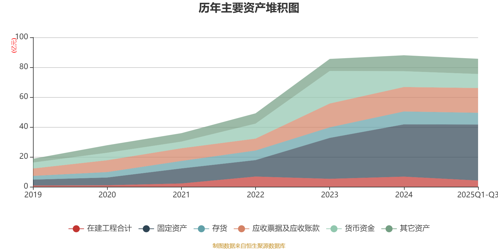 资产重大变化方面,截至2025年三季度末,公司固定资产较上年末增加7.08%,占公司总资产比重上升3.97个百分点;在建工程合计较上年末减少38.32%,占公司总资产比重下降2.81个百分点;其他流动资产较上年末减少38.3%,占公司总资产比重下降1.7个百分点;货币资金较上年末减少11.3%,占公司总资产比重下降1.07个百分点。