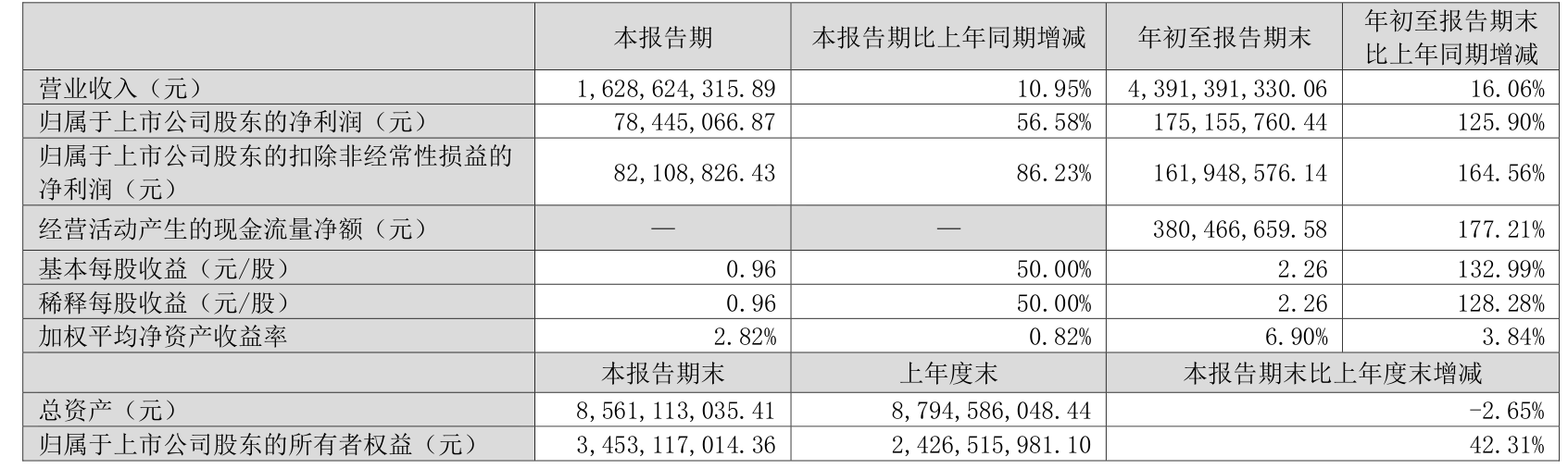 负债重大变化方面,截至2025年三季度末,公司应付债券较上年末减少100%,占公司总资产比重下降9.89个百分点;应付票据及应付账款较上年末减少13.74%,占公司总资产比重下降4.42个百分点;长期借款较上年末增加12%,占公司总资产比重上升2.02个百分点;一年内到期的非流动负债较上年末增加426.93%,占公司总资产比重上升1.78个百分点。