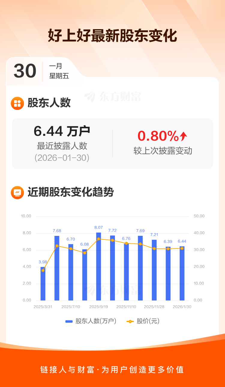 好上好:截至1月30日最新股东户数6.44万户,较上期增加0.80%