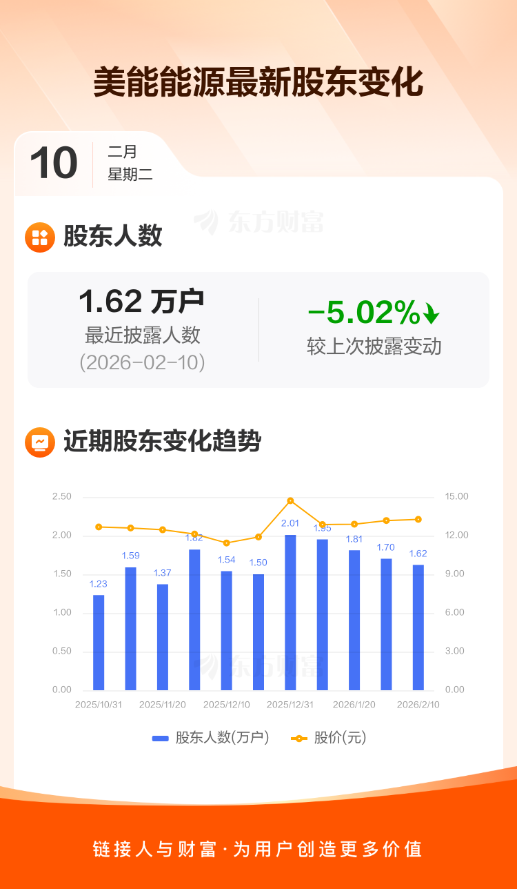 美能能源:截至2月10日最新股东户数1.62万户,较上期减少5.02%