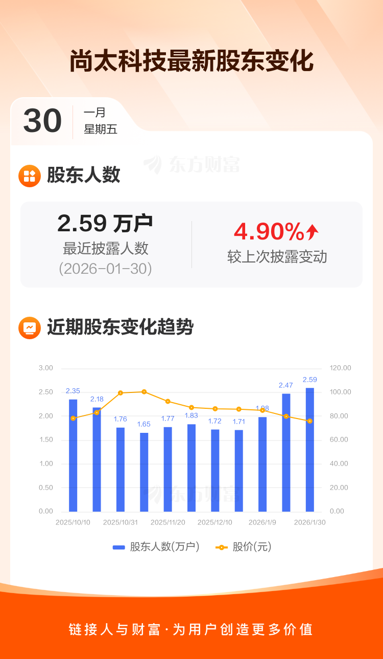 尚太科技最新披露数据显示,截至1月30日公司股东户数为2.59万户,较上期(2026年1月20日)增加1211户,增幅为4.90%。户均持有流通股数量由上期的7522股下降至7171股,户均持股金额由上期的60.03万元减少至54.40万元。