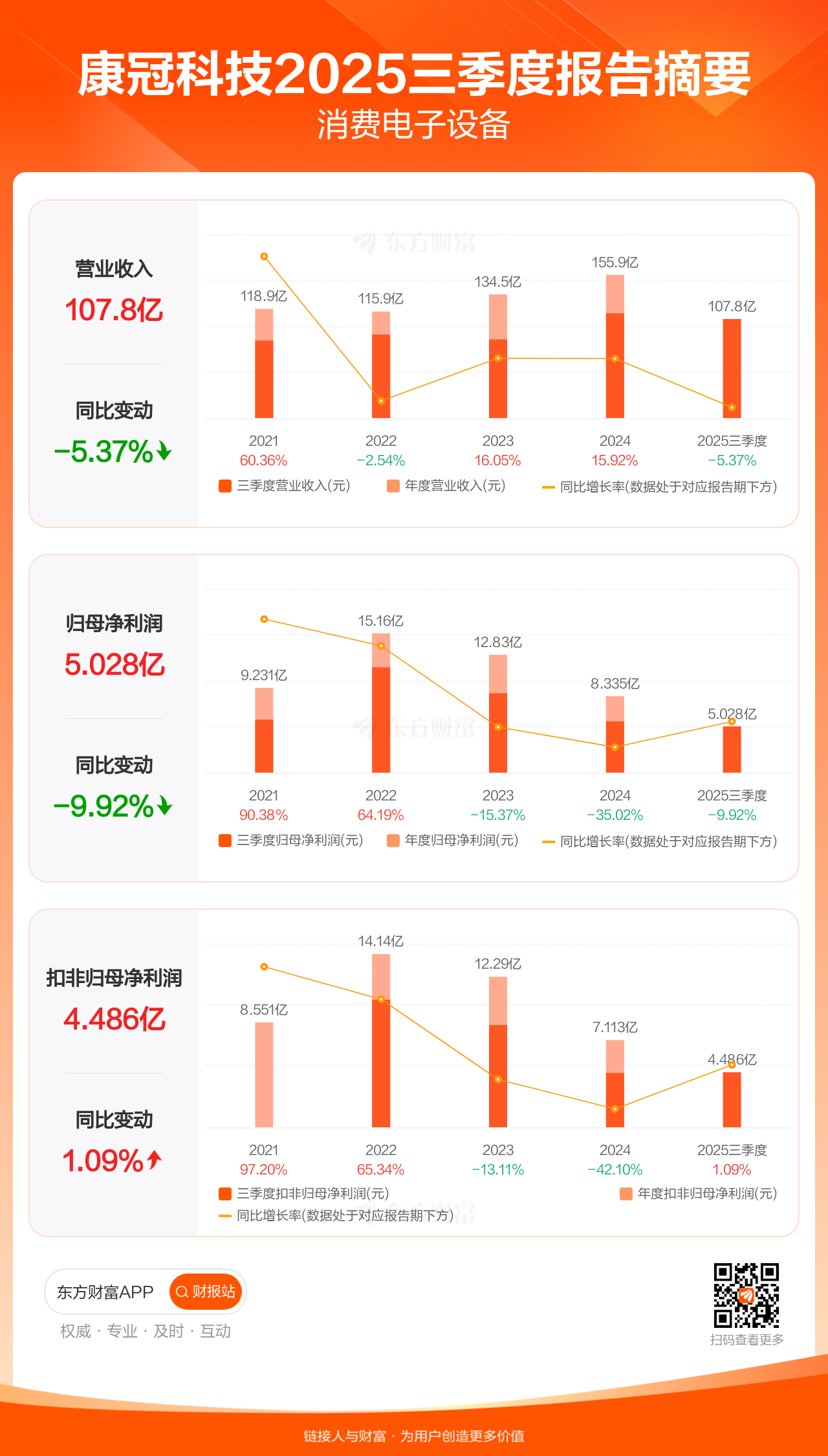 康冠科技10月29日发布2025年三季报显示,公司前三季实现营业收入107.80亿元,同比下滑5.37%;归母净利润5.03亿元,同比下滑9.92%;扣非归母净利润4.49亿元,同比增长1.09%。
