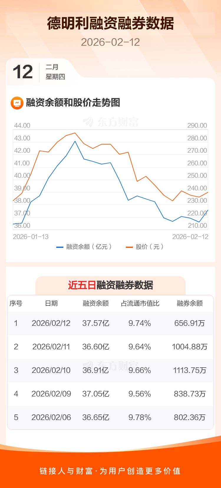 交易所最新数据显示,德明利于2026年2月12日获融资买入2.91亿元,融资偿还1.94亿元,当日融资净买入9719.96万元。目前,该股融资余额37.57亿,占流通市值比例为9.74%。