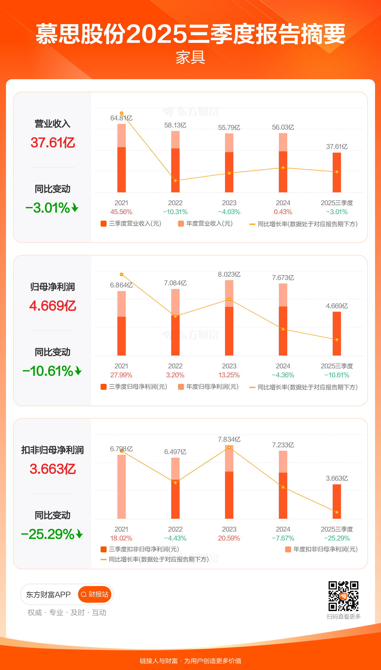 慕思股份10月30日发布2025年三季报显示,公司前三季实现营业收入37.61亿元,同比下滑3.01%;归母净利润4.67亿元,同比下滑10.61%;扣非归母净利润3.66亿元,同比下滑25.29%。