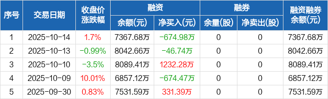 联域股份:融资净偿还674.98万元,融资余额7367.68万元(10-14)