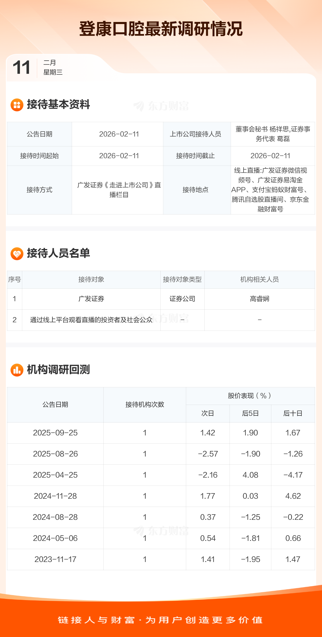 登康口腔2月11日公告称,2月11日接待广发证券等2家机构调研。接待人员包括董事会秘书 杨祥思,证券事务代表 葛磊。