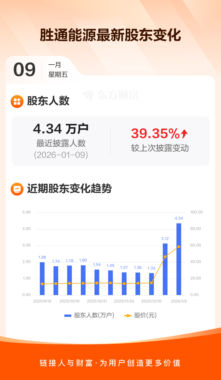 胜通能源:截至1月9日最新股东户数4.34万户,较上期增加39.35%