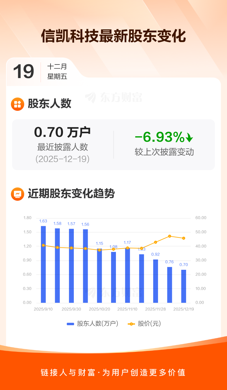 信凯科技最新披露数据显示,截至12月19日公司股东户数为7029户,较上期(2025年12月10日)减少523户,降幅为6.93%。户均持有流通股数量由上期的3103股上升至3334股,户均持股金额由上期的14.63万元增加至15.24万元。