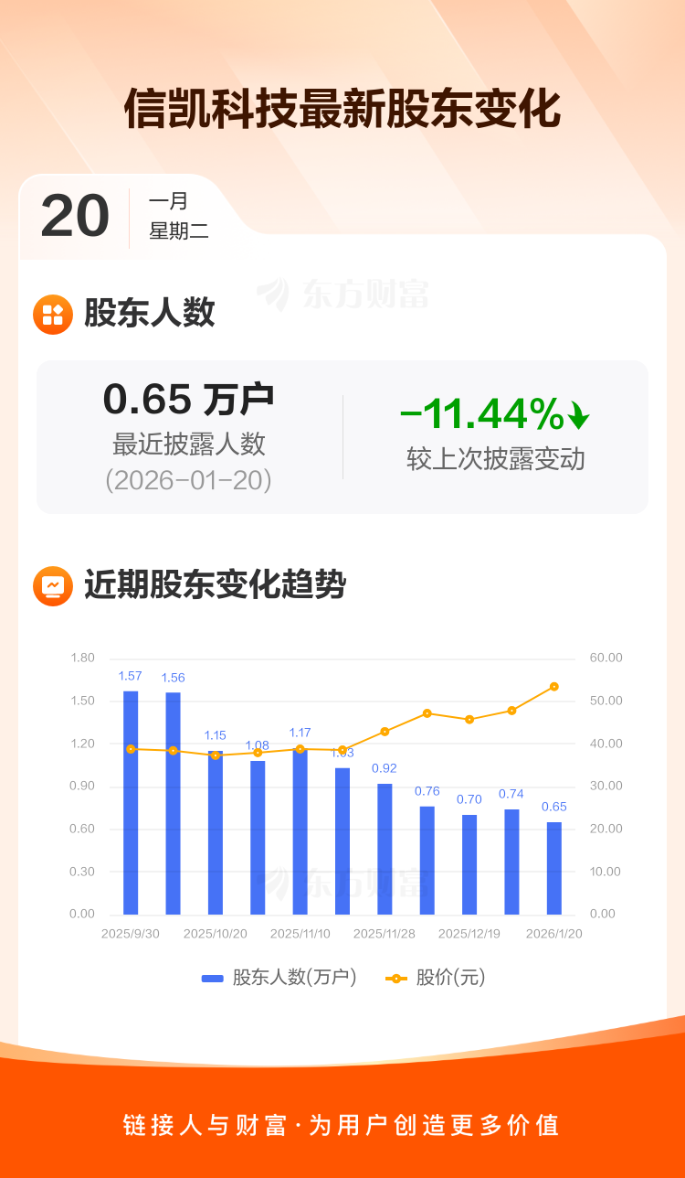 信凯科技最新披露数据显示,截至1月20日公司股东户数为6534户,较上期(2026年1月9日)减少844户,降幅为11.44%。户均持有流通股数量由上期的3176股上升至3586股,户均持股金额由上期的15.18万元增加至19.16万元。