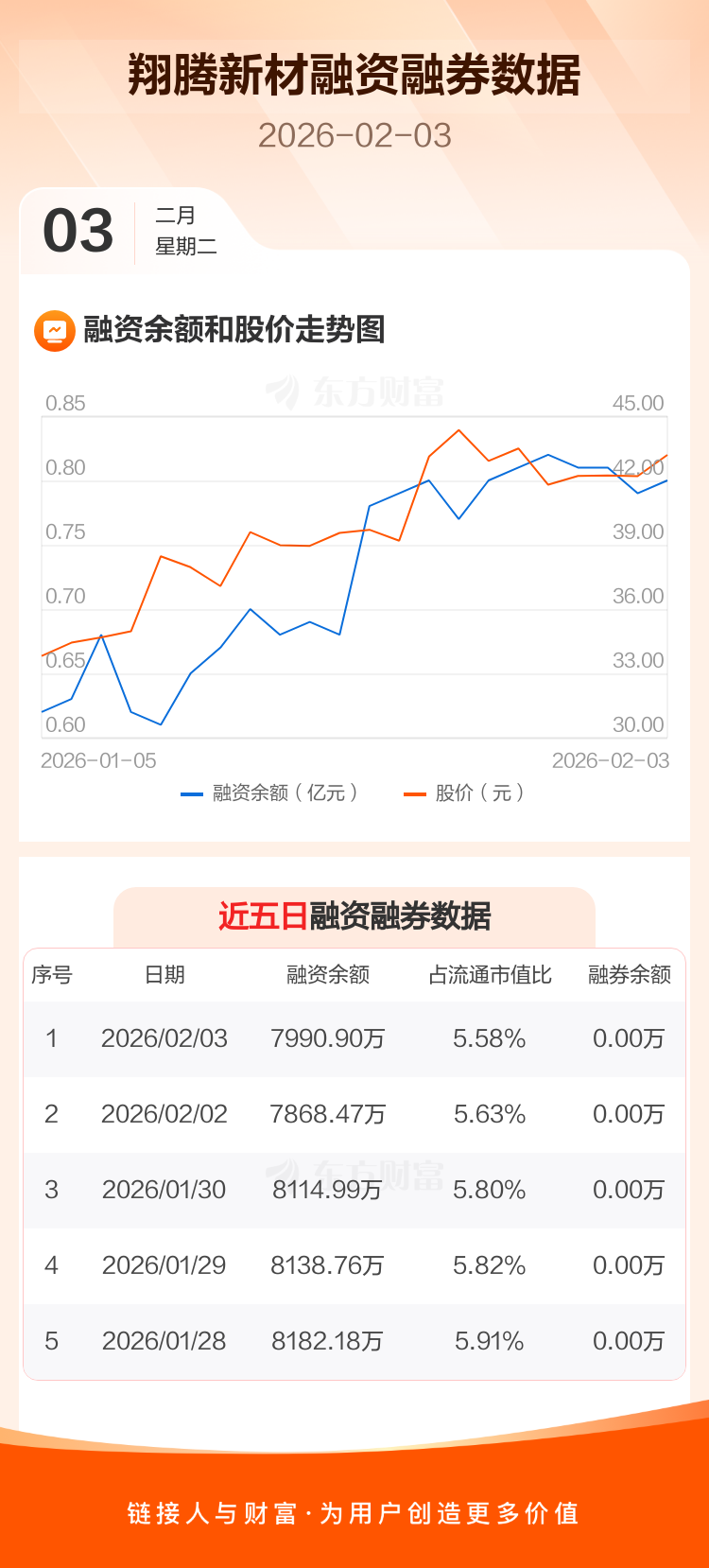 交易所最新数据显示,翔腾新材于2026年2月3日获融资买入660.11万元,融资偿还537.68万元,当日融资净买入122.43万元。目前,该股融资余额7990.90万,占流通市值比例为5.58%。