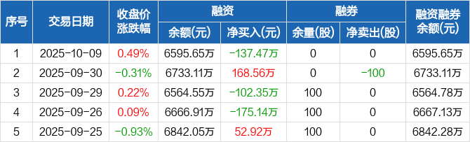 德冠新材:融资净偿还137.47万元,融资余额6595.65万元(10-09)