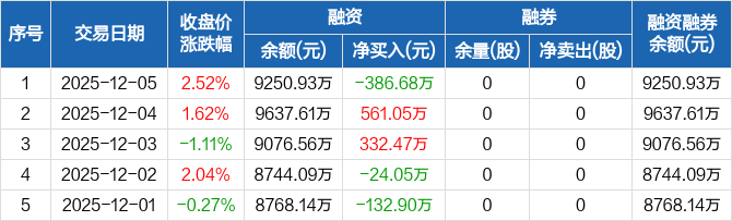 腾达科技:融资净偿还386.68万元,融资余额9250.93万元(12-05)