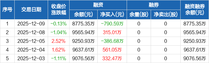 腾达科技:融资净偿还790.59万元,融资余额8775.35万元(12-09)