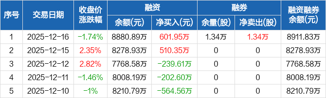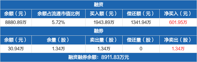 融资方面,当日融资买入1943.89万元,融资偿还1341.94万元,融资净买入601.95万元。融券方面,融券卖出1.34万股,融券偿还0股,融券余量1.34万股,融券余额30.94万元。融资融券余额合计8911.83万元。