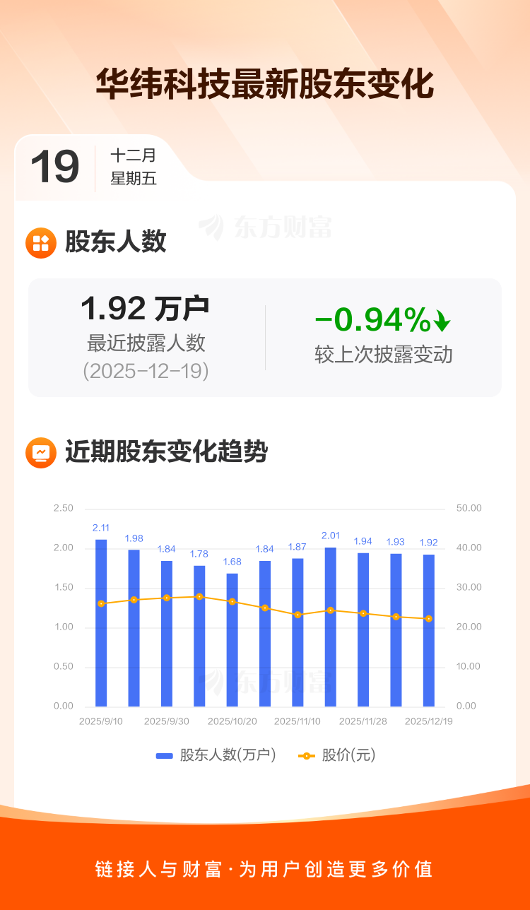 华纬科技:截至12月19日最新股东户数1.92万户,较上期减少0.94%