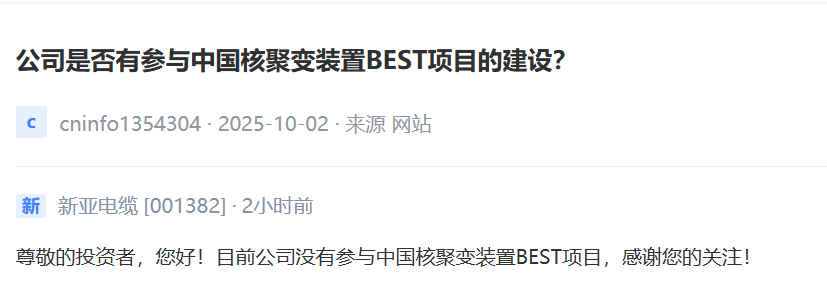 上证报中国证券网讯新亚电缆14日在互动平台上回答投资者提问时表示,目前公司没有参与中国核聚变装置BEST项目。