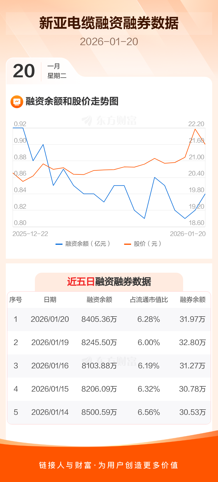 交易所最新数据显示,新亚电缆于2026年1月20日获融资买入1617.25万元,融资偿还1457.39万元,当日融资净买入159.85万元。目前,该股融资余额8405.36万,占流通市值比例为6.28%。