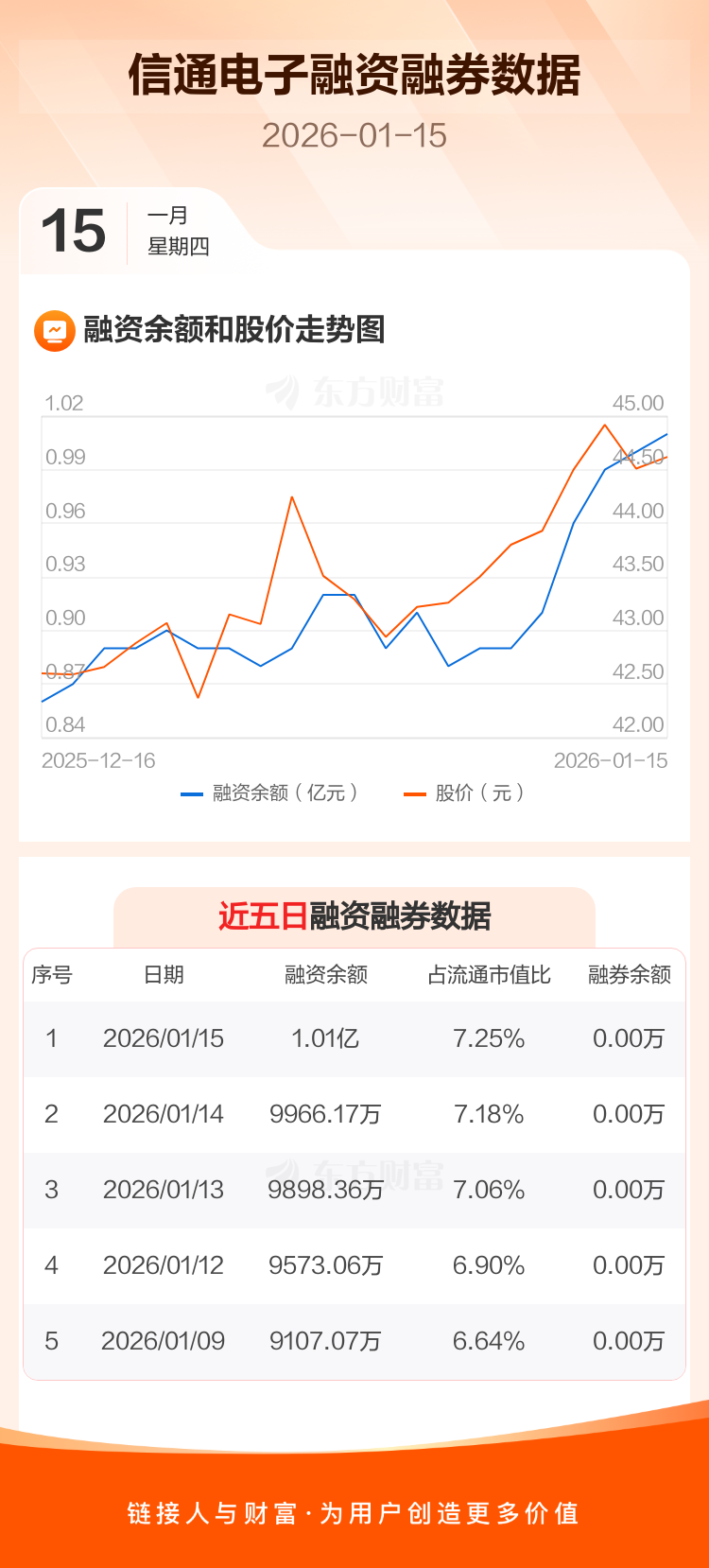 交易所最新数据显示,信通电子于2026年1月15日获融资买入772.96万元,融资偿还644.20万元,当日融资净买入128.76万元。目前,该股融资余额1.01亿,占流通市值比例为7.25%。