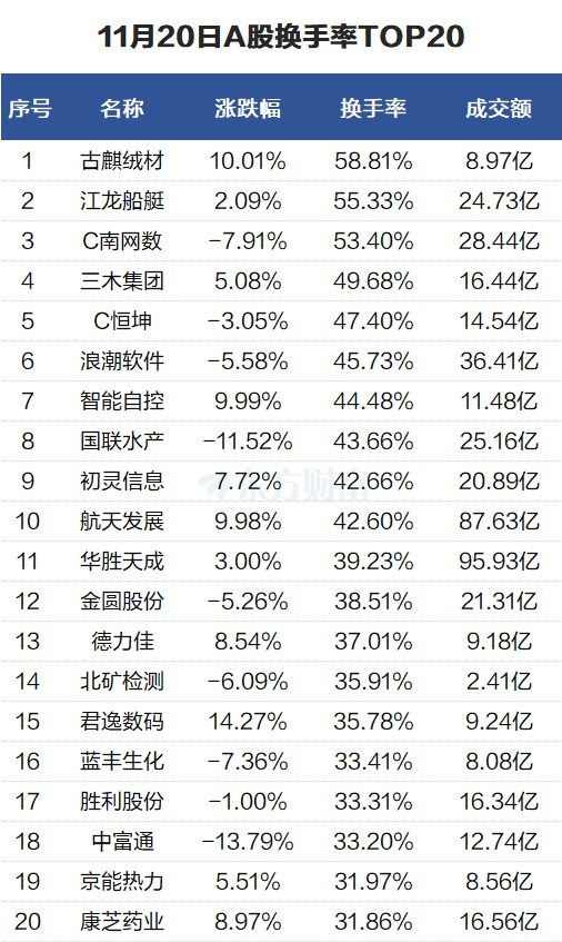当天换手率最高的个股为古麒绒材,全天换手率58.81%。江龙船艇紧随其后,全天换手率55.33%。