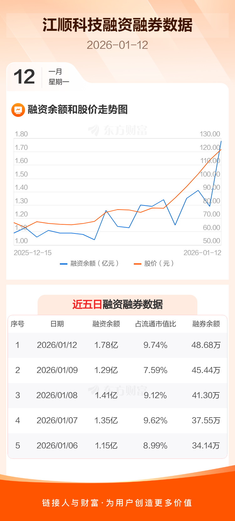 交易所最新数据显示,江顺科技于2026年1月12日获融资买入1.18亿元,融资偿还6932.49万元,当日融资净买入4849.75万元。目前,该股融资余额1.78亿,占流通市值比例为9.74%。