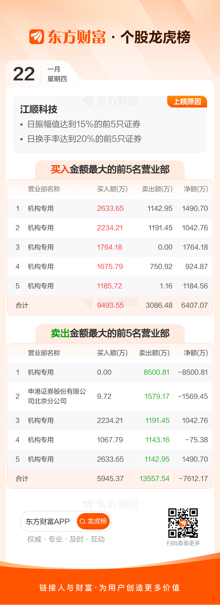 交易所2026年1月22日公布的交易公开信息显示,江顺科技因成为日振幅值达到15%的前5只证券、日换手率达到20%的前5只证券上榜。江顺科技当日收报110.52元,涨跌幅1.86%,偏离值15.56%,换手率36.69%,成交额6.13亿。