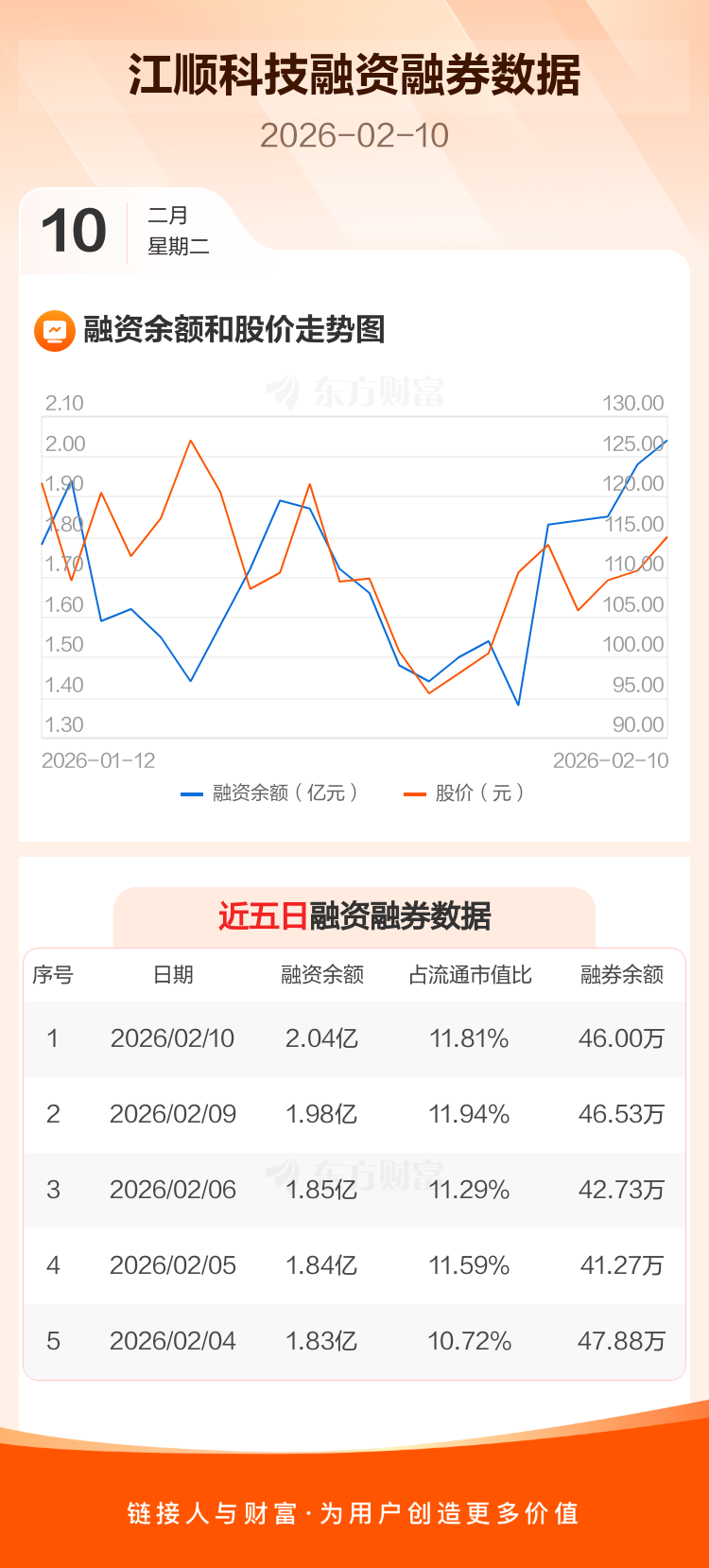 交易所最新数据显示,江顺科技于2026年2月10日获融资买入3630.09万元,融资偿还3096.68万元,当日融资净买入533.41万元。目前,该股融资余额2.04亿,占流通市值比例为11.81%。