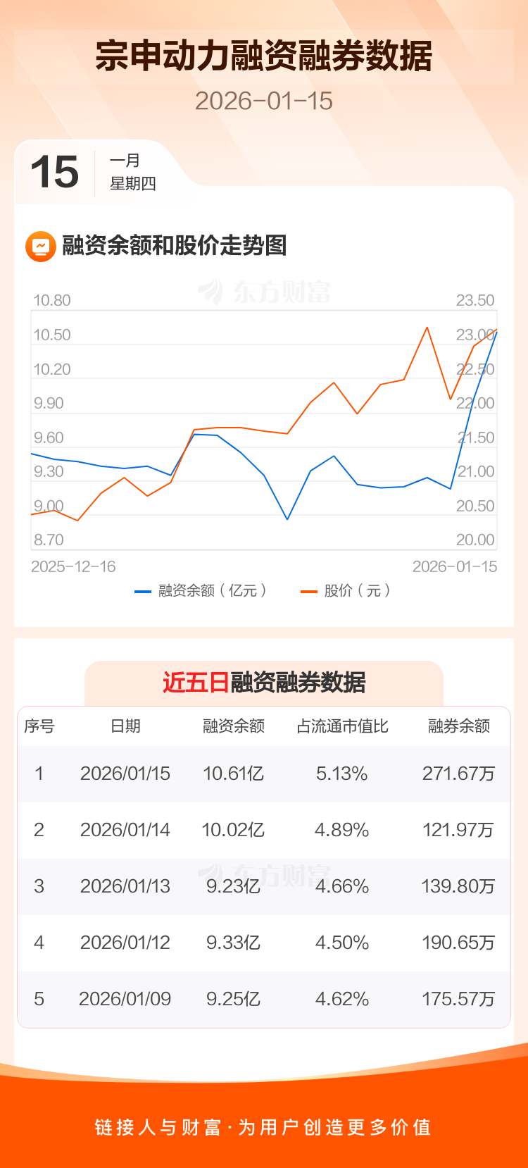 交易所最新数据显示,宗申动力于2026年1月15日获融资买入1.61亿元,融资偿还1.02亿元,当日融资净买入5883.43万元。目前,该股融资余额10.61亿,占流通市值比例为5.13%。